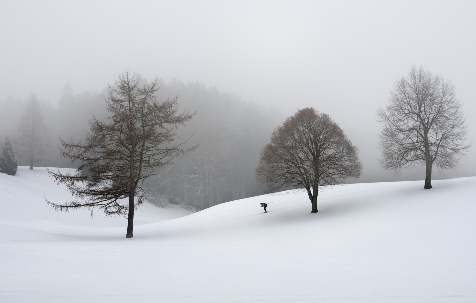 Last winter I spent some days in the Bavarian Alps. Weather was not what I hoped it would be, but grey and snowy around 0° C. On one of my walkes I discovered an area, in summer used as golf course. This explained the strange appearance of this area.